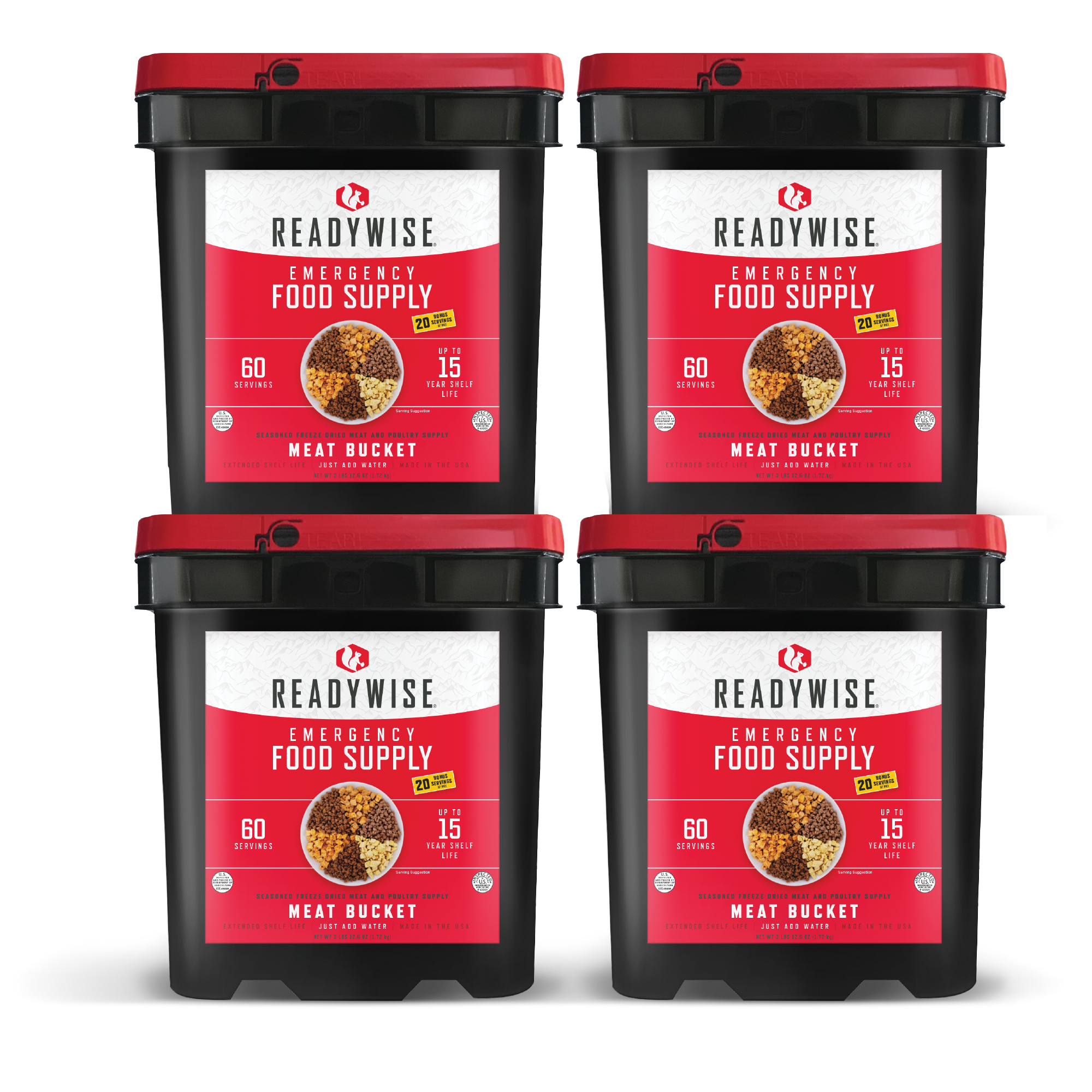 4 buckets of 60 servings of meat. Variety includes: Teriyaki chicken, southwest style chicken, roasted chicken, stroganoff beef, cheesy ground beef, and roasted ground beef.