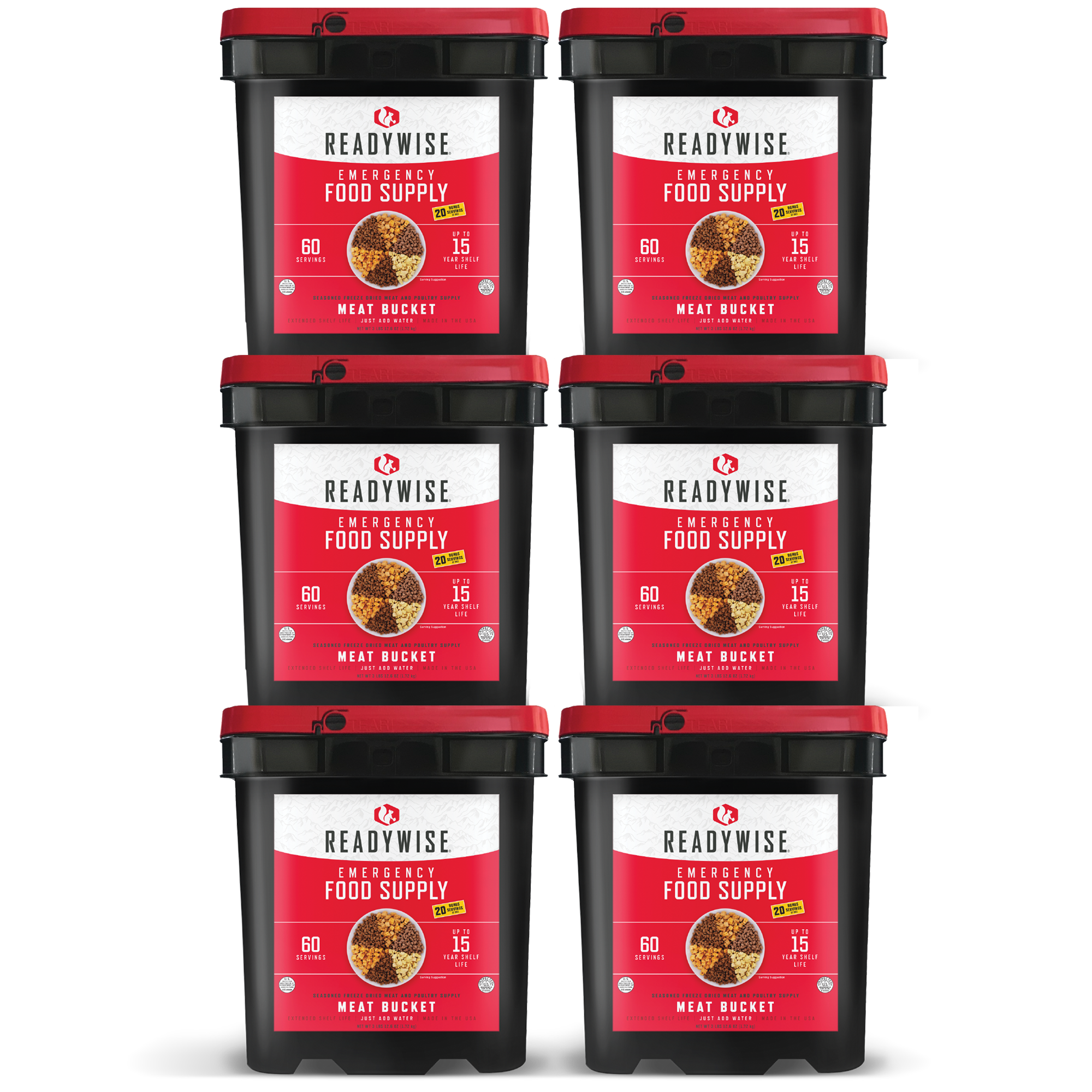 6 buckets of 60 servings of meat. Variety includes: Teriyaki chicken, southwest style chicken, roasted chicken, stroganoff beef, cheesy ground beef, and roasted ground beef.