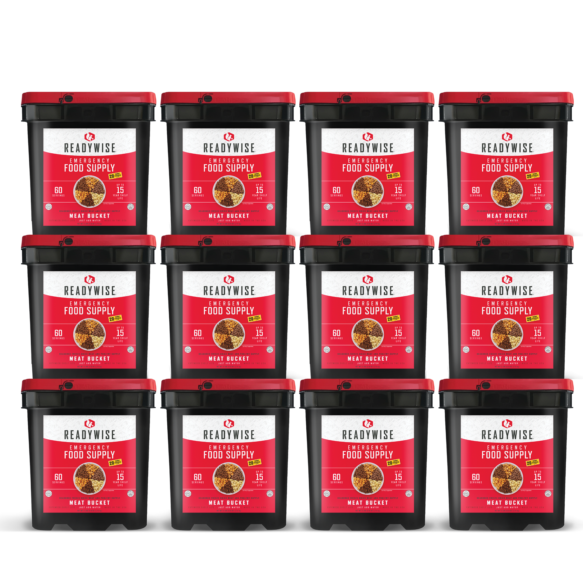 12 buckets of 60 servings of meat. Variety includes: Teriyaki chicken, southwest style chicken, roasted chicken, stroganoff beef, cheesy ground beef, and roasted ground beef.