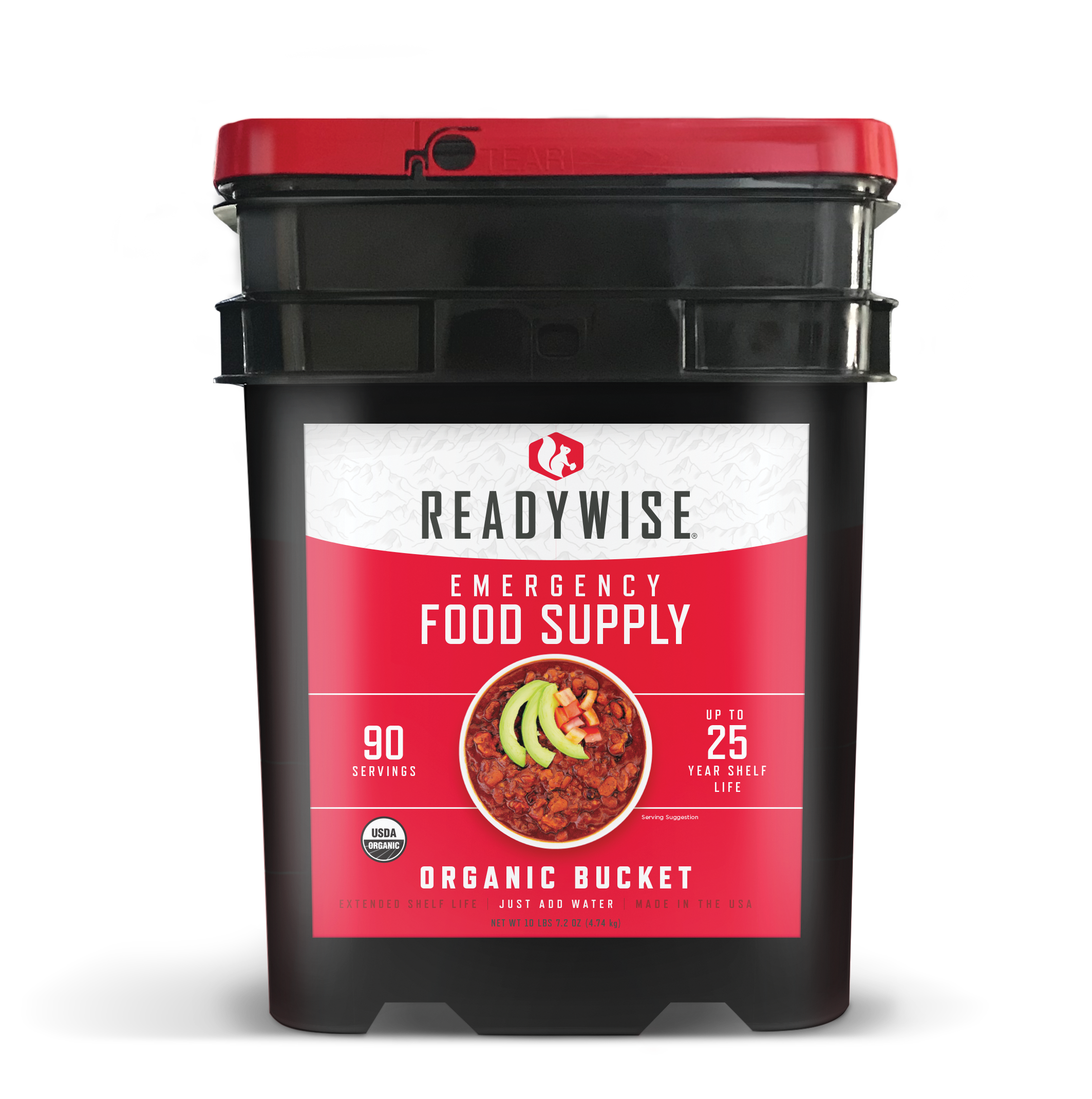 Our 90 serving organic bucket is a perfect addition to any food supply. Whether you’re affected by a snow storm, hurricane or other weather emergency, it’s wise to be prepared. These great-tasting freeze-dried and dehydrated foods are ready in minutes when you just add water. They also come in stackable buckets with an easy Grab-N-Go handle, so they’re easy to store and transport.